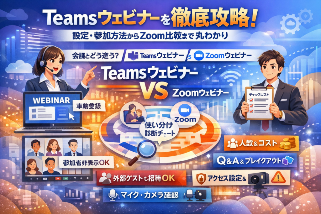 さらに、人数上限と料金・ライセンスの実務ライン、Teamsウェビナー参加方法、参加できない・設定できないときの確認手順、録画・マイク・カメラの事故を防ぐチェックリストまで一気通貫で解説します。社内研修、顧客向けセミナー、採用イベントなど代表的なシーン別に「この条件ならどの器・どの設定にすべきか」がそのまま判断できるよう設計しているため、この記事を読まずに手探りで準備すること自体がリスクになります。最初の1本を事故なく成功させたいなら、このまま読み進めてください。