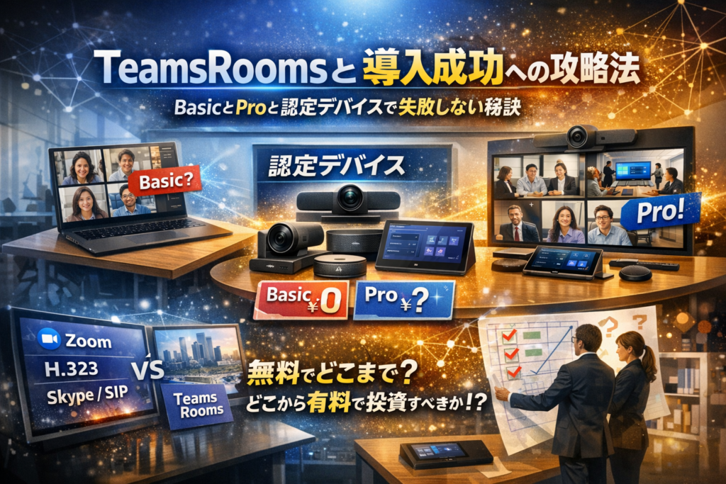 本記事は、Teams Rooms BasicとProのライセンスと価格の整理から、LogicoolやYealink、Poly、Lenovo、HPなどの認定デバイス選定、Windows版とAndroid版の違い、会議室の広さ別構成、画面レイアウトや画面共有の使い方までを、実務視点で一気通貫で解説します。さらに、Standard終了時の混乱や、認定デバイス以外を混在させた結果サポートが迷走した事例、Zoom Roomsや既存H.323会議システムからの乗り換えで起きがちな失敗も、原因と回避策まで踏み込みます。