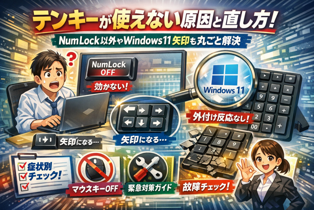 「急いで数字を打ちたいのにテンキーだけ沈黙」——現場の経理や事務で一番ストレスが高い場面です。焦る前に、まずは症状ベースで原因を一気に絞り込むのが近道です。