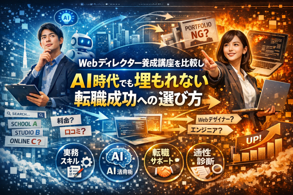 Webディレクター養成講座を比較しているのに、どれを選んでも同じに見えて決めきれない。この時点で、すでに目に見えない損失が始まっています。料金やブランド名、口コミだけで判断すると、受講後に「現場で通用しないスキル」と「転職に直結しないポートフォリオ」だけが残りやすいからです。
