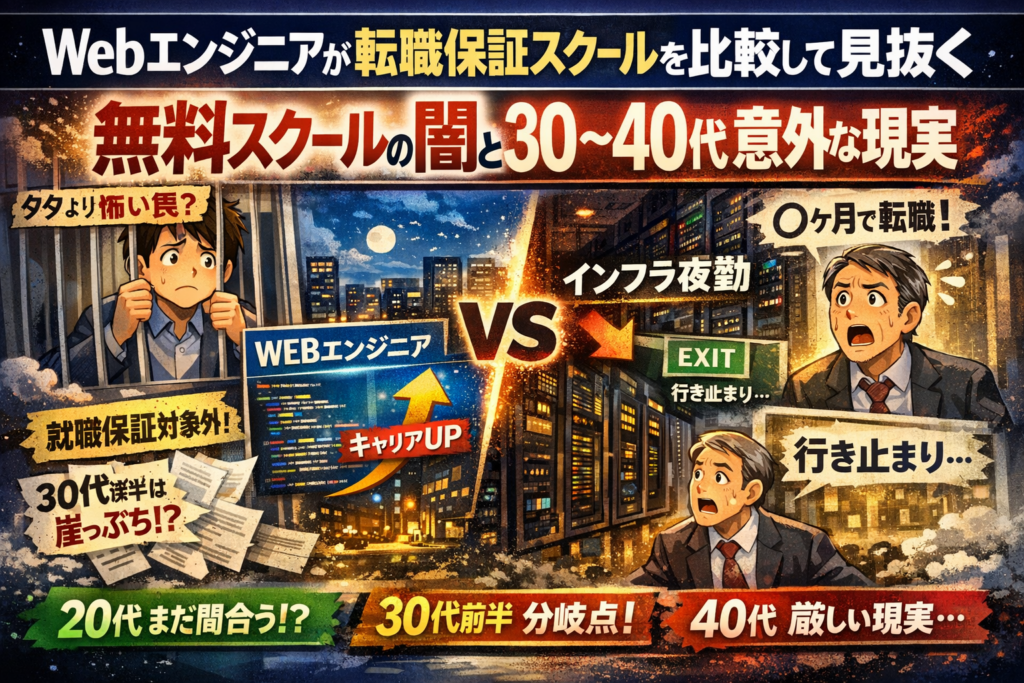 無料か有料かより、求人の質と自分の条件をどこまでコントロールできるかが勝負どころです。30代や40代の未経験転職では、そもそも保証制度の対象外になりやすいため、「無料で学ぶ+転職エージェントで求人を精査」「有料スクールでWeb開発特化のカリキュラムを受ける」といった組み合わせを、冷静に比較することが重要になります。