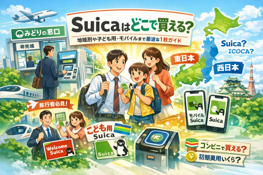 本記事では、首都圏通勤者、地方から東京・仙台・新潟へ向かうビジネスパーソン、子ども用Suicaを持たせたい保護者、西日本や札幌・福岡在住の旅行者という4タイプ別に、どの駅でどの種類のSuicaが買えるか、そもそもSuicaにこだわるべきかを整理します。コンビニでの購入とチャージの違い、Suica発行に何円かかるか、モバイルSuicaの作り方や登録できない典型パターン、西日本でのSuicaとICOCAの現実的な選び方まで、一連の判断を一本の導線でたどれる構成です。