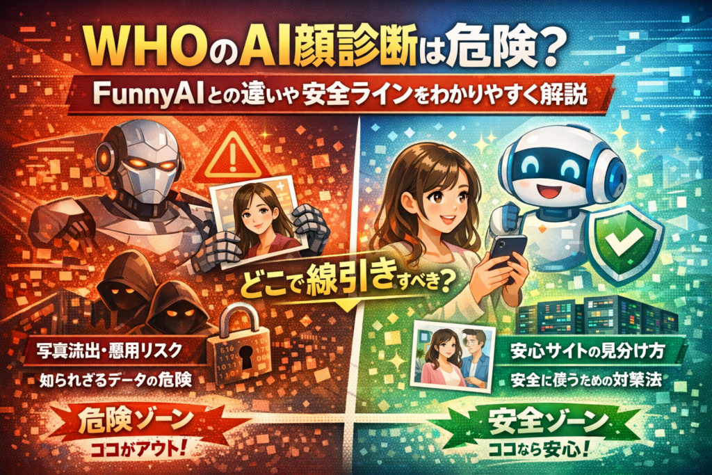 この記事では、WHO AI顔診断 危険と検索する人が本当に知りたい、3つの結論だけを軸に整理します。どこまでが「比較的安全」で、どこからがアウトなのか。FunnyAIやAI診断comなど無名サイトとWHOAIの違いは何か。すでに顔診断サイトに写真を出してしまった場合、今から何をすればダメージを最小限にできるのか。