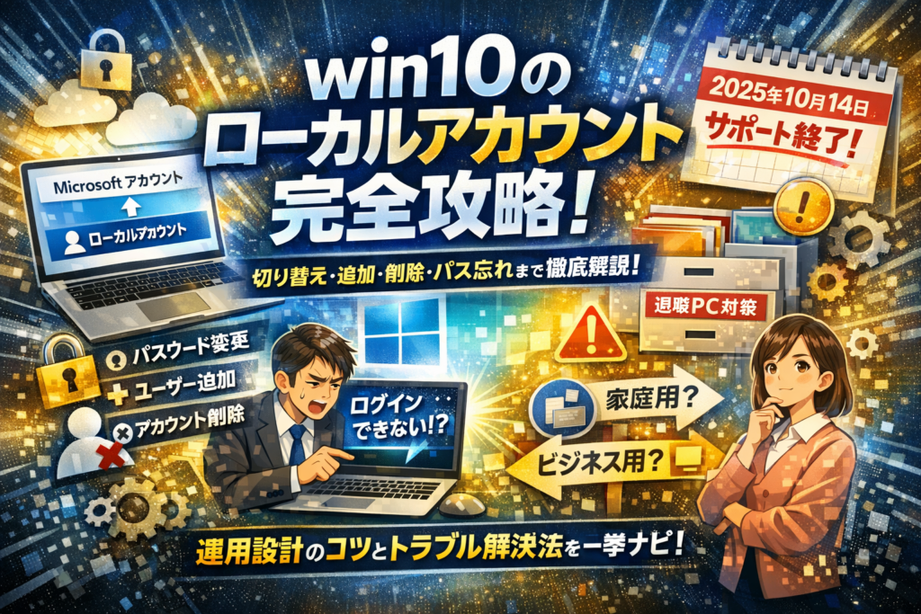 本記事は、win10ローカルアカウントの初期設定やMicrosoftアカウントからの切り替え、ユーザー追加・名前変更・削除、パスワード変更やパスワードを忘れたときの現実的な選択肢までを目的別に即引きできるnaviとして整理しつつ、家庭利用と中小企業・店舗利用での運用設計の違いまで踏み込みます。さらに、Windows10サポート終了後もローカルアカウントで使い続けるか、Windows11へ移行しつつMicrosoft365アカウントとどう切り分けるかという「今決めておくべき線引き」も具体化します。手元のPC1台の設定から、WebやMEO運用を含むアカウント設計全体まで、一気に整えたい方は読み進めてください。