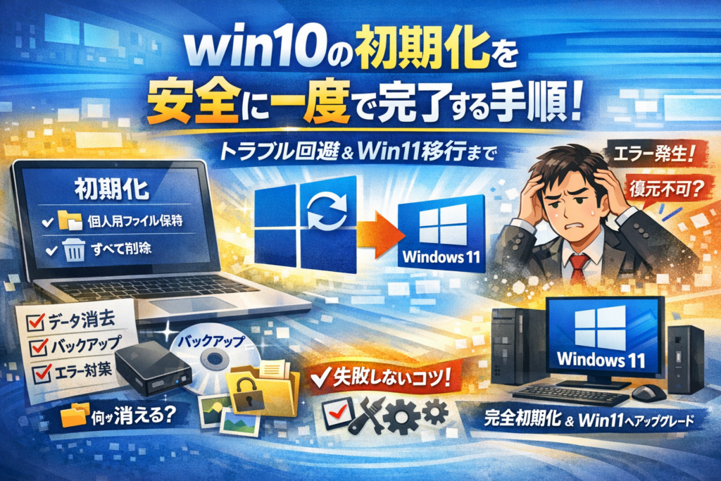 この記事では、win10初期化方法や具体的な手順だけでなく、「何が消えて何が残るのか」「初期化できない・進まない・エラーが出たときにどこを見るか」「初期化後にどこまで設定すれば仕事環境が元通りになるか」を、業務利用を前提に整理します。さらに、売却や廃棄前の完全データ消去と工場出荷状態の正しい使い分け、再インストールやWindows11移行との違いまで踏み込みます。この記事を読み進めれば、win10初期化の時間やリスクを事前に把握し、「一度で安全に終わらせる」ための判断基準と手順を、自分でコントロールできるようになります。