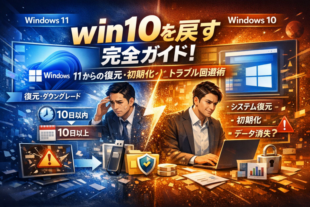 本記事は、まず「自分はWindows11からwin10に戻したいのか、それともwin10の状態だけを数日前に戻したいのか」を4パターンで切り分けたうえで、10日以内/10日以上のダウングレード、システムの復元、前のバージョンに戻す、このPCを初期状態に戻す、出荷時に戻すといった選択肢を、リスクと時間を含めて比較します。さらに、「Windows11 右クリック win10 戻す」「エクスプローラーだけwin10風に戻す」などUIだけ変えたいニーズや、「復元ポイントがない」「システムの復元が終わらない」といった詰みかけた状況で、プロが実務で取る現実的な打ち手も整理しています。この記事を読み進めれば、「どの方法で戻すか」「そもそも今win10に戻すべきか」を、感覚ではなくビジネスを守る基準で決められるはずです。