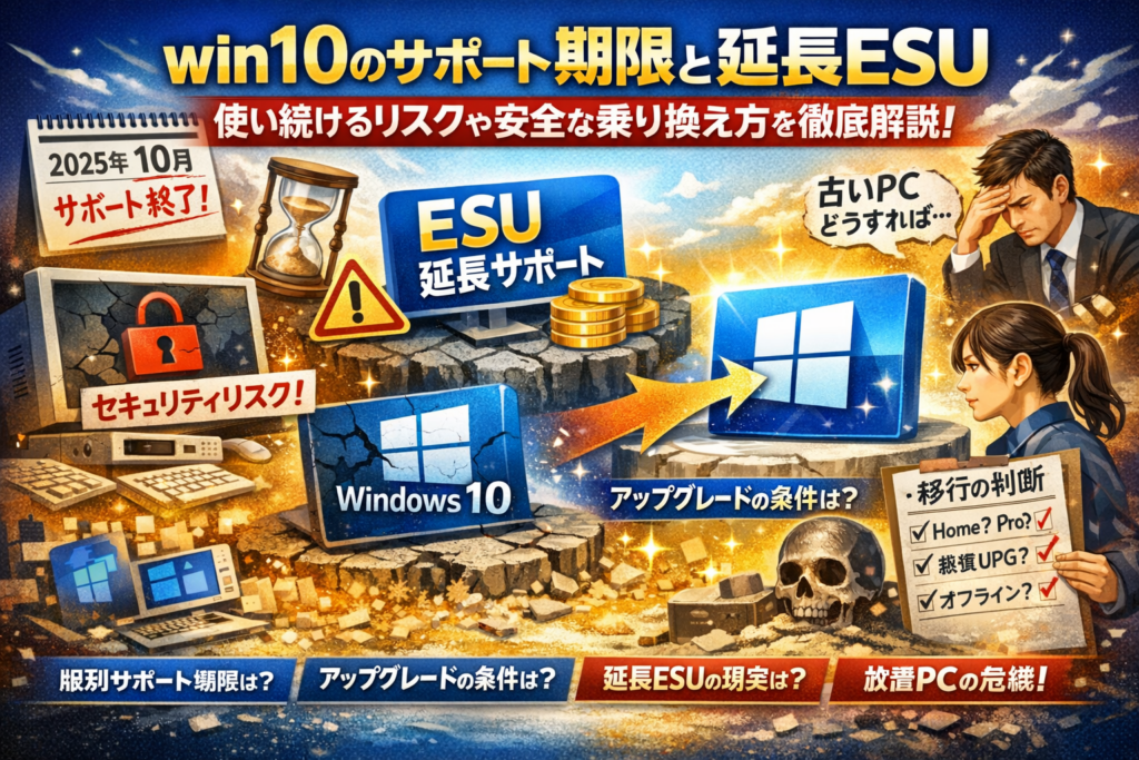 本記事は、win10 サポート期限を日本時間で正確に押さえつつ、エディション別・バージョン別の一覧、ESU延長の現実、Windows10 サポート終了後も使い続ける場合のセキュリティリスク、ネット接続しない・オフライン運用の限界、Windows11 無償アップグレードの可否と代替案まで、個人・小規模事業・中小企業それぞれの「実務レベルの判断軸」に落とし込みます。