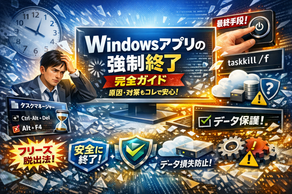 本記事ではWindows10とWindows11の両方で、タスクマネージャー以外も含めた最短かつ安全な強制終了手順を、状況別に整理します。Alt+F4などのショートカットやタスクバーからの終了、Ctrl+Alt+Delや仮想デスクトップ、taskkillコマンドまでを比較し、どの場面で何を使うべきかを明確にします。さらに、メモリ不足や常駐アプリ、アップデートなどフリーズの原因と再発防止策、タスクマネージャーで終了してはいけないプロセスやデータ保存のコツも網羅します。