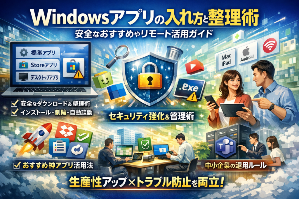 本記事では、Windowsアプリを標準アプリ・Storeアプリ・デスクトップアプリに分けてリスクで整理し、Windows11と10での安全なダウンロードとインストール、インストール済みアプリ一覧の表示とアンインストール、自動起動と強制終了の制御までを一気通貫で解説します。さらに、仕事や勉強に効くおすすめ無料アプリから、MacやiPad、Androidからのリモート接続、TeamsやExcelなど業務アプリを含めた中小企業の運用ルール構築まで、「何を入れないか」「どこから入れるか」で生産性とセキュリティを両立させる具体策を提示します。PCを道具として本気で使い倒したい方ほど、ここから先を読み飛ばすのは損失です。