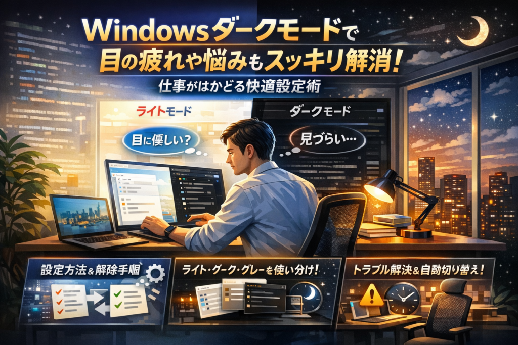 残業続きの夜に、画面だけギラギラ白いまま。これでは仕事より先に目が限界にきます。そこで登場したのが、画面を暗めの配色に切り替えるダークモードです。単なる「黒いテーマ」に見えて、実は仕事効率と目の負担を左右する重要な設定になっています。