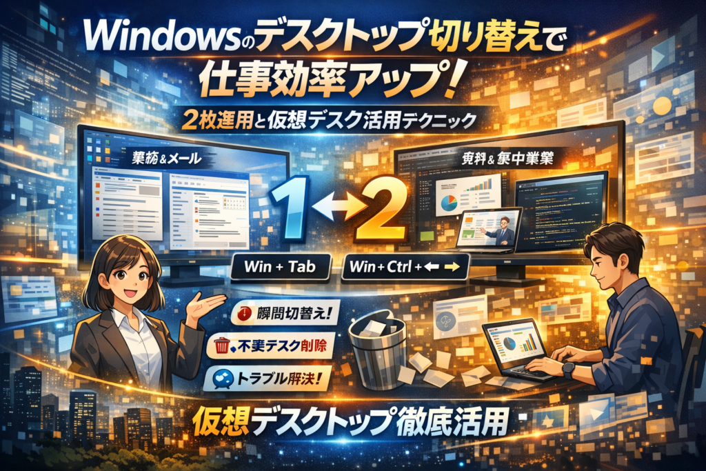 仮想デスクトップは「増やせるだけ増やす機能」ではなく、「役割ごとに画面を切り替えるスイッチ」として割り切ると、残業時間を確実に削れる武器になってくれます。