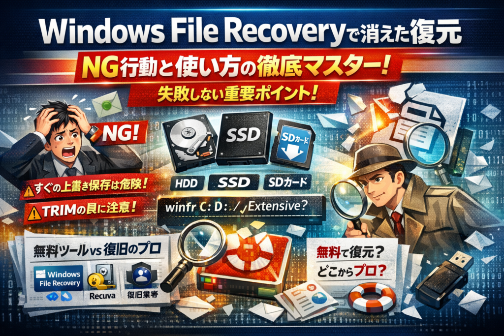 消してはいけないファイルを消した瞬間から、あなたのデータは「技術の問題」ではなく「時間と判断の勝負」になります。Windows File RecoveryがMicrosoft公式の無料ツールで、HDDやSSD、USB、sdカードの削除データをコマンドで復元できることは、多くの解説で語られています。しかし現場で問題になるのは、「どのモードで、どのドライブに、どの順番で試すか」を誤り、上書きとTRIMで復元可能性を自分で削ってしまう点です。