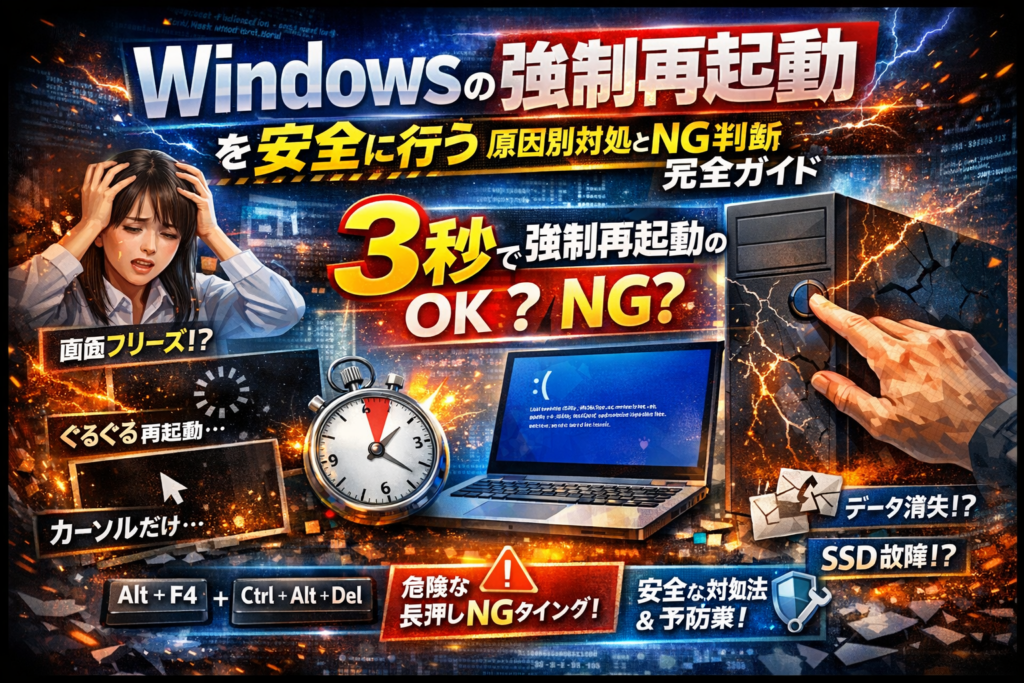この先を読み進めれば、「windows 強制再起動 できない」「windows 強制再起動 画面真っ暗」と再検索を繰り返さなくても、自分の状況に最適な一手と、二度と同じトラブルで作業を止めないための予防策まで手元にそろいます。