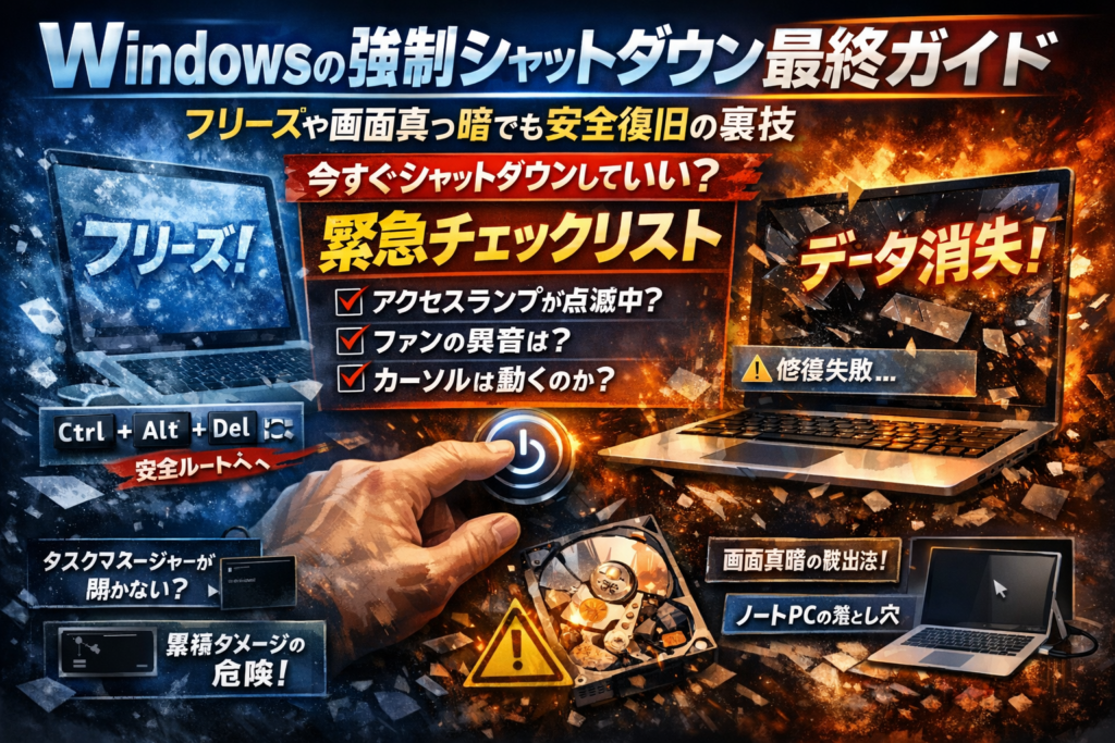 パソコンがフリーズして動かない、画面が真っ暗で矢印だけ、電源ボタン長押しでも切れない…。多くの人がここで「仕方ない」とwindowsの強制シャットダウンに踏み切りますが、実はこの一手が、数週間後の起動不能や業務データ消失のきっかけになっているケースが少なくありません。しかも危ないのは「1回の失敗」ではなく、「なんとなく毎回電源長押しで落とす」という習慣です。