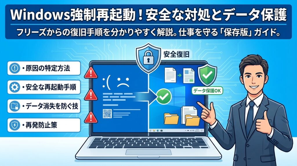 本記事では、Windowsで強制再起動する前に行うべき30秒の確認、キーボードだけで行う安全な再起動方法、タスクマネージャーやshutdownコマンドを使った段階的な対処法を具体的な手順として整理します。そのうえで、再起動が終わらないときに「どのくらい待つか」の現場感覚の目安、画面真っ暗やカーソルのみ表示といった起動トラブル別の診断ポイント、強制再起動が頻発する原因の切り分け方、リモート環境での落とし穴まで踏み込みます。