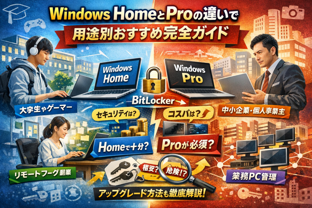 本記事は、Windows11/10のHomeとProの違いを、BitLockerやリモートデスクトップ、グループポリシー、MDM(Intune)といった専門用語をかみくだき、「大学4年間」「副業・リモートワーク」「10台〜100台の業務PC」という具体的な環境で、Homeで十分なケースとProにしないと後から高くつくケースをはっきり線引きします。さらに、HomeからProへのアップグレード料金と手順、DSP版や格安プロダクトキー、中古でPro搭載PCが妙に安い理由とライセンスの落とし穴まで、現場の失敗例を前提に解説します。