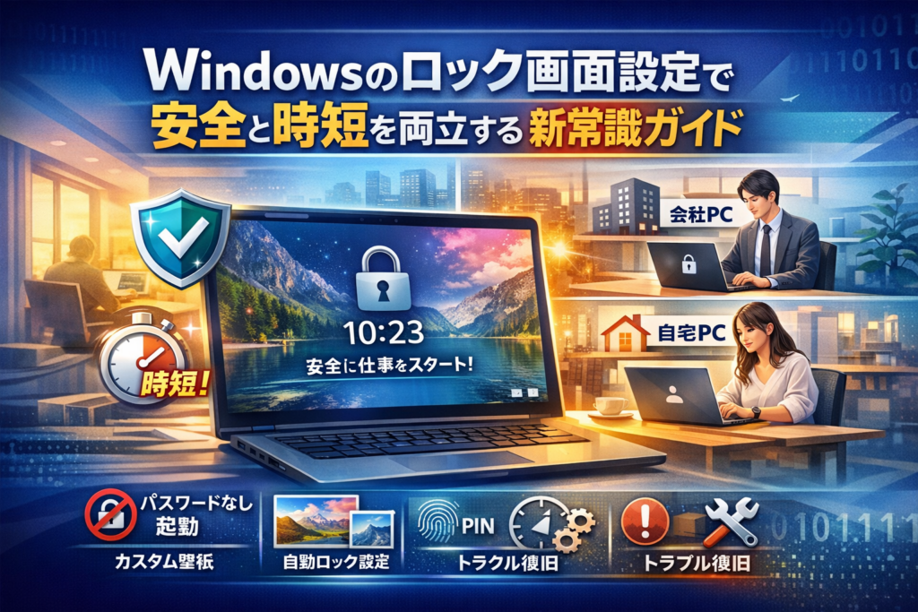 このガイドでは、Windows10とWindows11のロック画面について、基本操作から画像や壁紙のカスタマイズ、起動時やスリープ復帰時のパスワードなし設定の可否、画面ロックの時間調整、自動ロックの挙動までを一気通貫で整理します。さらに、在宅勤務のパソコン、会社支給PC、家族共有のノートパソコンそれぞれに最適な設定例を示し、情報漏えいを防ぎながら「ロックが邪魔」という現場のストレスも減らすための具体的な落としどころを提示します。