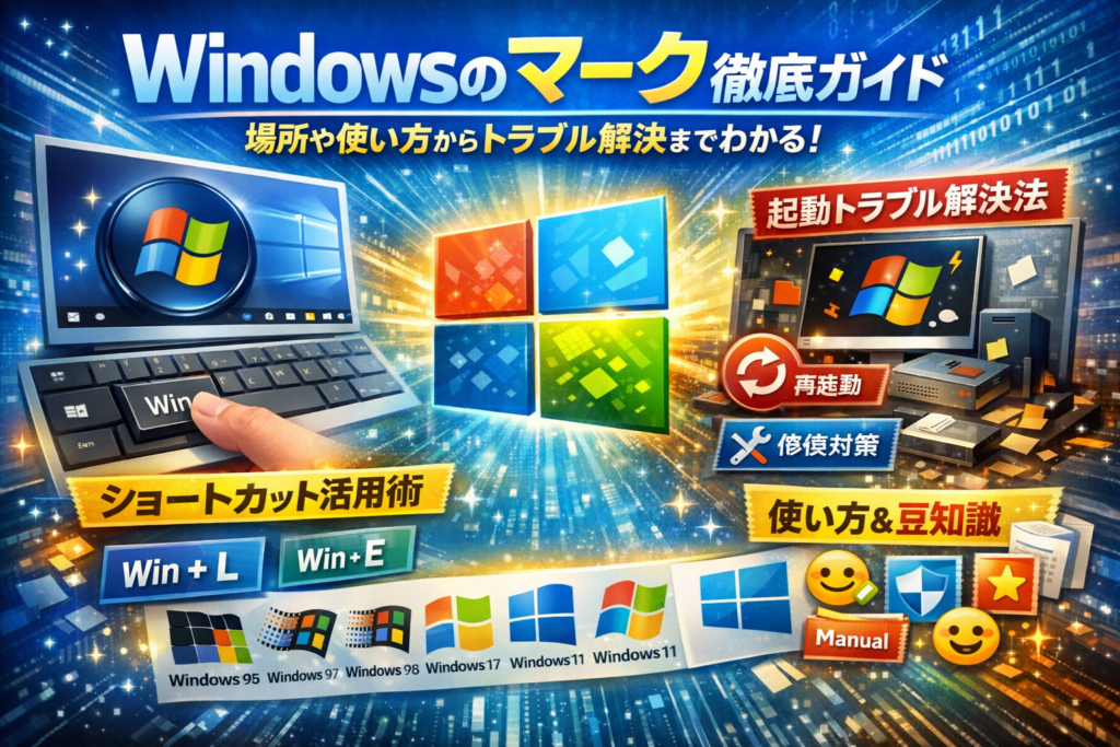 Windowsマークをあいまいなまま使っていると、作業時間もトラブル対応もじわじわ損をします。スタートボタンやキーボードのWindowsキーがどこか分からない、Win+LやWin+Eのショートが使えない、ロゴ画面から進まない。そのたびにマウスで探し回ったり、強制終了を繰り返したりしているなら、すでに大きな機会損失が発生しています。