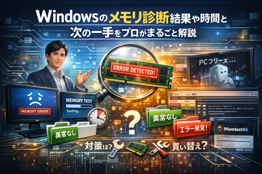 PCトラブルを「メモリかどうか」だけで見ないことが、仕事を止めない最大のコツです。メモリ診断はあくまでチェックリストの1項目として位置づけ、イベントビューアーやストレージ診断と組み合わせて、原因を立体的に追い詰めるイメージを持っておくと、余計な遠回りをせずに済みます。