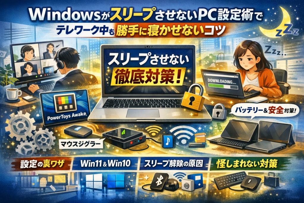 本記事では、Windowsの電源オプションやコントロールパネルの具体的な設定だけでなく、BluetoothキーボードやSurfaceタイプカバーが原因のスリープ解除、システム無人スリープタイムアウト、PowerToys Awakeなどのツール運用までを、テレワーク現場を前提に体系化します。「PCをスリープさせない」こととバッテリー寿命やセキュリティをどう両立させるかを軸に、あなたの環境に最適な画面オフとスリープのバランスを一気に設計できる構成にしています。