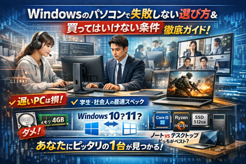 この記事では、大学生・高校生・社会人それぞれについて、レポート+ブラウザ+Web会議を同時に動かしても困らないGB数のメモリ、Core i3やi5、RyzenなどCPUの選び方、SSD容量、ノートパソコンとデスクトップPCのどちらを選ぶべきかを、具体的な線引きで示します。さらに、買ってはいけない条件(HDD搭載機、古いIntel世代、ストレージ不足など)を明示し、Windows11は無料か、いつ買い替えるべきかといった不安も整理します。