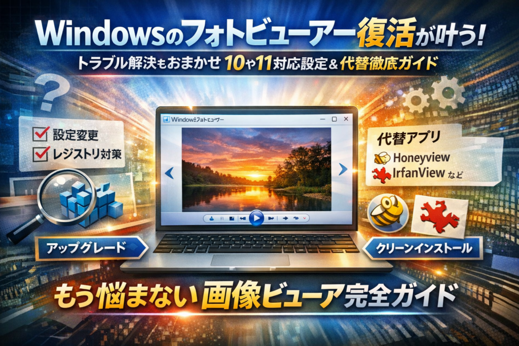 本記事では、Windowsフォトビューアーとは何かを整理したうえで、アップグレードかクリーンインストールかの違いを起点に、設定アプリからの既定アプリ変更、photoviewerの場所の確認、レジストリやdllに触れるかどうかの判断軸まで段階的に示します。さらに、表示できない・メモリ不足・印刷できないといったエラーの原因をファイル形式やシステム要因に分解し、HoneyviewやIrfanView、FastStone Image Viewerなどの具体的な代替アプリも含めて、家庭とビジネスの両方で再インストール後も困らない画像ビューア運用へと組み立て直します。