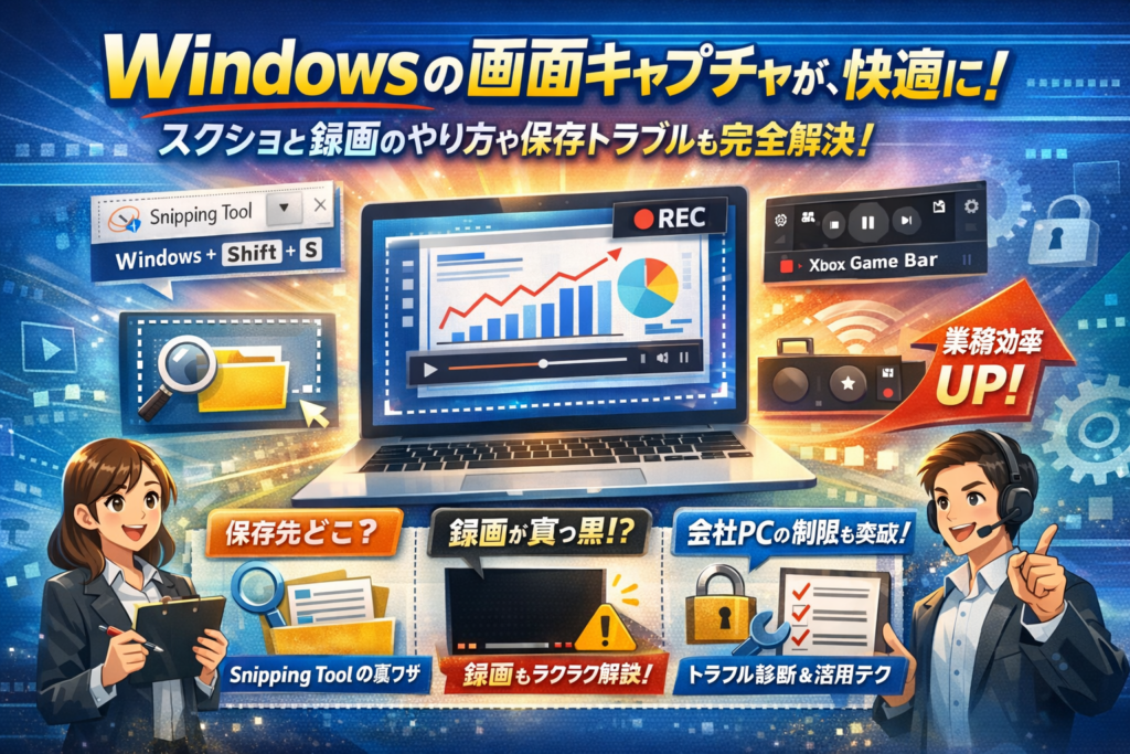 本記事では、Windowsの画面全体・アクティブウィンドウ・範囲指定キャプチャから、Snipping ToolやXbox Game Barによる録画まで、今この画面を最短で正しく残すための手順を先に整理します。そのうえで、保存先トラブルの診断手順、マニュアルやeラーニングで“伝わる画像・動画”の作り方、ScreenToGifやBandicamなどアプリの使い分けまで、現場で差がつく運用ノウハウをまとめました。