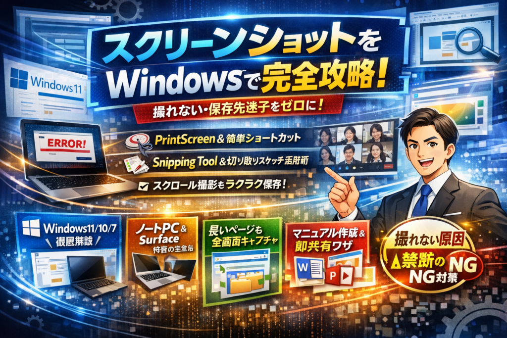 本記事では、スクリーンショット Windowsの基本操作から、Snipping Tool・切り取りスケッチ・ゲームバーの実務的な使い分け、ノートパソコンやSurface固有のFnキー問題、リモートデスクトップやVDIで撮れない理由までを一気に体系化します。さらに、長いページをスクロールキャプチャする方法、保存先とファイル管理のルール、社内マニュアルや資料作成で「その場で撮ってすぐ共有する」実務ワザまで具体的に示します。ここで5分かけて読み切れば、以後の「スクショ迷子」の時間はゼロに近づきます。