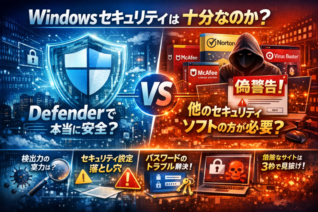 この記事では、特定のソフトを売り込むのではなく、「どのレベルの利用ならwindowsセキュリティだけで足りるのか」「どこから先は追加対策が不可欠なのか」を、私が日々見ている現場のつまずきと再発防止策をベースに整理しています。パソコンを買い替えるたびに悩み続けるのではなく、今日この時点で自分の環境の基準を決めてほしい、そのための判断材料を一式まとめておきたくて執筆しました。