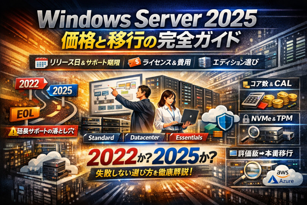 Windows Server 2025の情報を「リリース日」「サポート期限」「価格表」「エディションの違い」で個別に調べている時点で、すでに時間とお金を静かに失っています。実務で効く判断軸は、仕様の暗記ではなく、どのタイミングで何を2025へ載せ替えるか、どのエディションとライセンス形態を選べば将来の仮想マシン増設や監査で詰まないかに尽きます。この記事では、Windows Server 2025 Standard/Datacenter/Essentialsの違い、コアライセンスとCALの考え方、Windows Server 2022との比較、サポート期限とEOLの読み方、評価版ISOの使い方から本番移行までを、実案件で起きたトラブルとセットで整理します。システム要件とサーバー選定、NVMeやTPMへの対応、クラウド併用を含めて、導入前の一週間で決めるべきポイントを一気通貫で押さえれば、高くつく延長サポートやライセンス監査のリスクをかなり削れます。単なるWindows Server 2025の概要紹介ではなく、「どれを、いつ、どう買い、どう構成するか」の答えを取りにいく前提で読み進めてください。