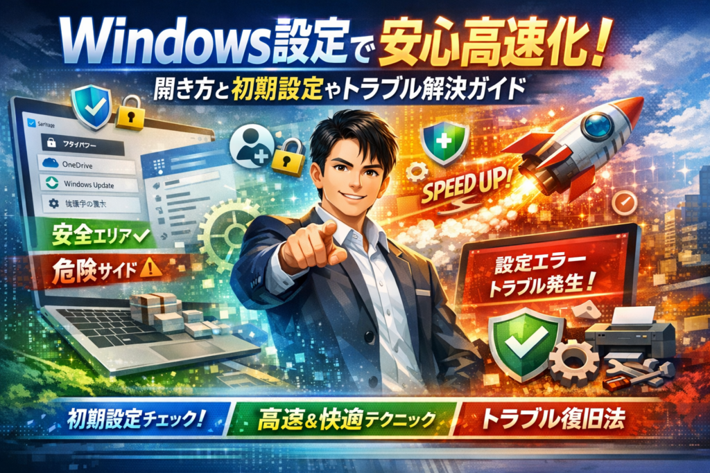 本記事では、設定アプリの場所と開き方、ショートカットやコマンド、検索による最速アクセスから、初期セットアップの手順、MicrosoftアカウントとPIN・Windows Helloの設計、OneDriveやプライバシーとセキュリティ、タスクバーやロック画面の広告カット、電源オプションと視覚効果の調整までを「ここまでなら安全」「ここから先は危険サイド」という線引き付きで整理します。さらに、Windowsセキュリティやファイアウォールで止めてはいけない機能、リモートデスクトップや共有フォルダ、プリンタが使えなくなる設定切りすぎの典型パターン、そして「設定が開かない・落ちる」時の現実的な3ステップ復旧ルートまで網羅します。