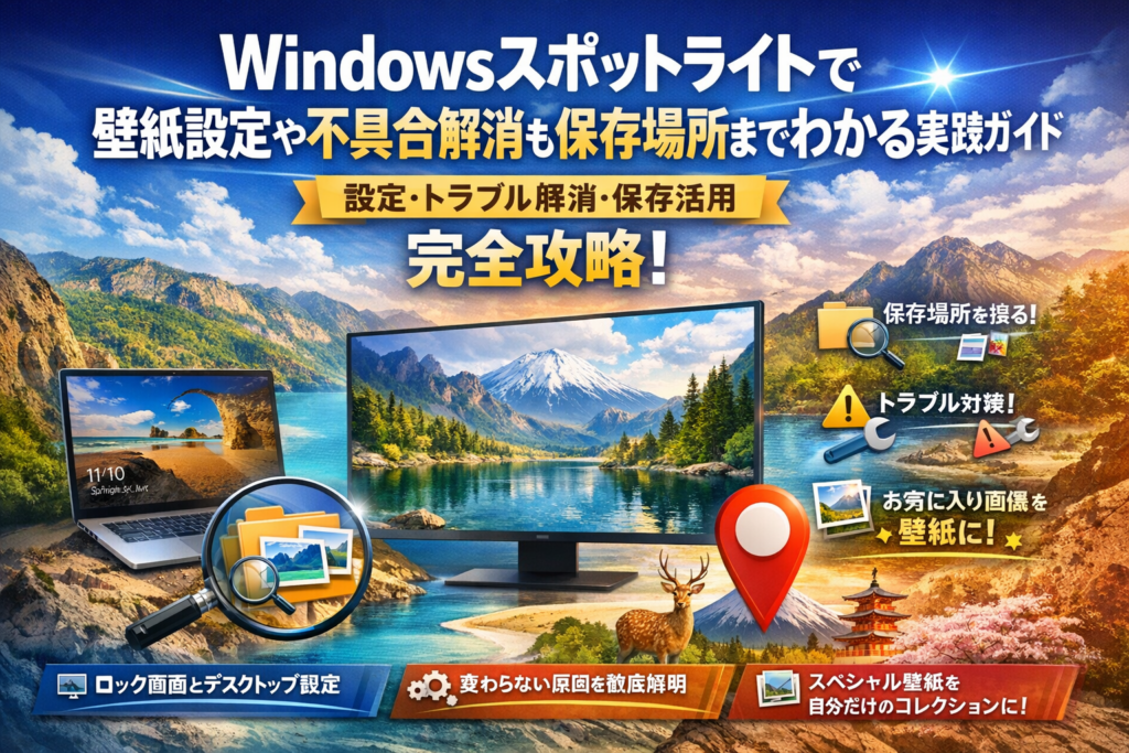 本記事では、Windows11/10双方での正しい設定方法から、「Windows スポットライトが変わらない」原因をリスクの低い順に切り分け、ロック画面とデスクトップ背景の違いまで一気に整理します。そのうえで、気に入った画像を壁紙として固定する安全な手順や、保存場所を辿って自分だけのコレクションを作る方法、「場所を知りたい」「日本や動物の画像だけ見たい」といったニーズへの現実解も示します。さらに、業務PCや複数台管理の視点から、ポリシー制御環境でどこまでユーザーが触って良いかのラインも明確にします。