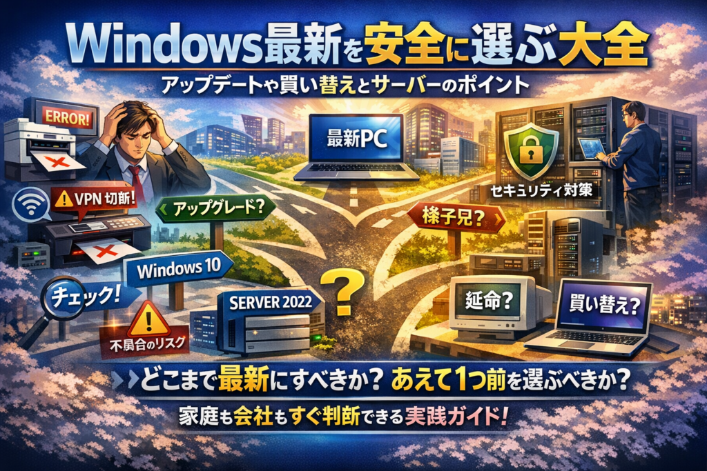 自分のPCがwindows 最新かどうか確認する30秒の手順から、windows10からwindows11へ移るべきか迷ったときの分岐点、windows server 最新との組み合わせ方、買い替えと延命どちらが得かまで、家庭のなんちゃって管理者から中小企業情シスまでが即決できる実務ロジックを一気に提示します。ここを押さえずにアップデートや買い替えを進めることこそ、最も高い「隠れコスト」になります。