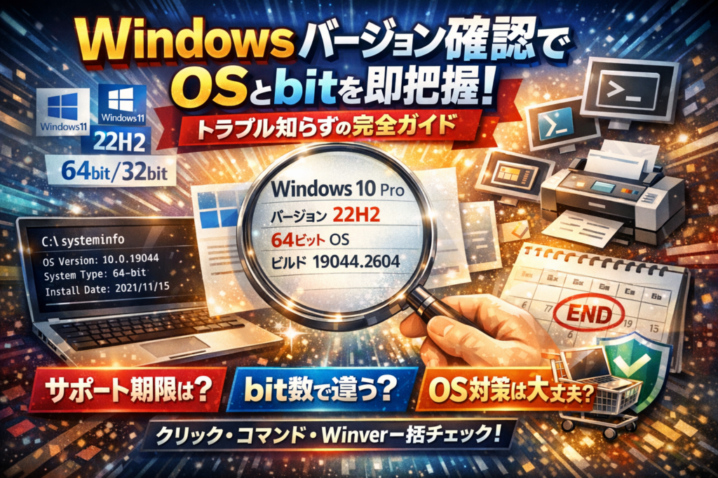 本ガイドでは、Windows10とWindows11のバージョン確認方法を、設定画面からのクリック操作、ショートカットとwinver、cmdやPowerShellでのsysteminfoコマンドまで一気通貫で整理します。さらに、PCのbit数確認からドライバー選定、Windows Updateやセキュリティパッチの確認、サポート終了に備えた買い替え・バージョンアップ判断、複数PCを扱う情シス向けの一括把握の考え方までカバーします。
