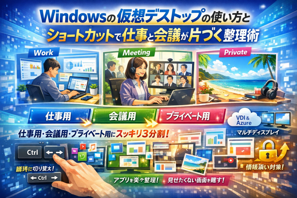 本記事では、Windows10とWindows11の仮想デスクトップの基本操作とショートカットを押さえつつ、「仕事用・会議用・プライベート用の3デスクトップ」へ整理する具体的テンプレートを提示します。アプリやウィンドウを仮想デスクトップ間でどう移動させるか、重い・勝手に切り替わるといったトラブルの原因、VDIやAzureバーチャルデスクトップ、マルチディスプレイとの使い分けまで、業務で実際に成果が出た運用ルールだけに絞って解説します。