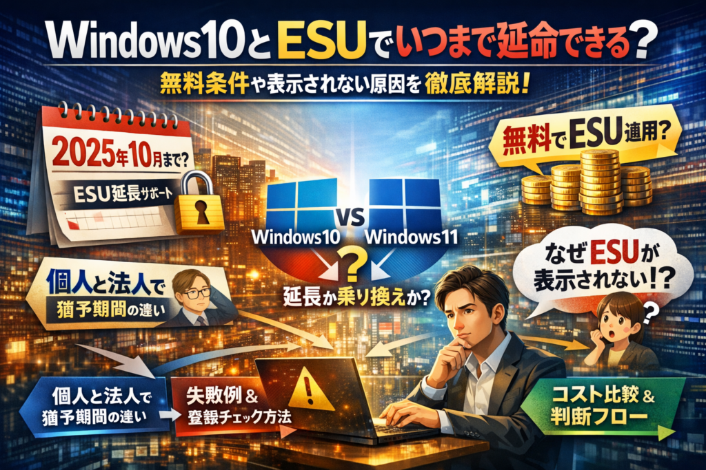 本記事では、windows10 ESUの「いつまで」「価格」「無料」「個人と法人の違い」を一枚で整理したうえで、ESUの申し込み・適用方法と確認方法、ウィザードや案内メッセージが表示されない典型パターン、ローカルアカウントや業務用PCで登録できない原因を、現場で使われている手順だけに絞って解説します。さらに、20台〜100台規模の法人で、ESUとWindows11リプレースをどう組み合わせるかを、台数ベースで比較できる判断フローチャートも用意しました。ここまで押さえておけば、「なんとなくESU」「なんとなく買い替え」という高くつく選択を避け、必要なPCだけを狙って延長サポートに乗せる判断ができるようになります。