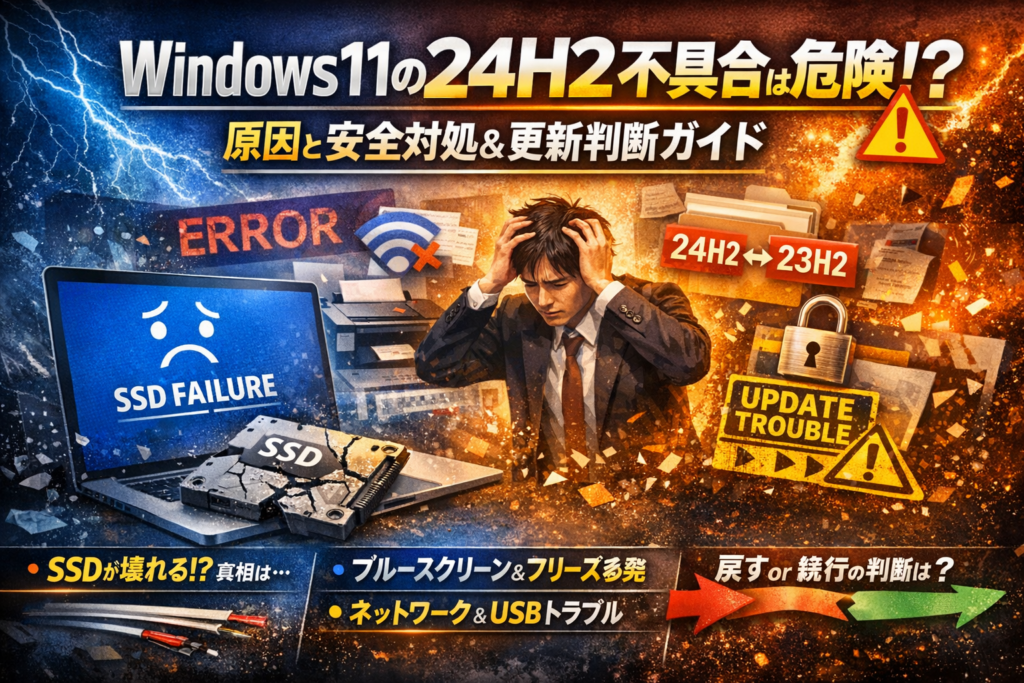 本記事は、windows11 24h2 不具合の最新情報を整理しつつ、アップデートできない原因のチェックポイント、ブルースクリーンやエラーコード別の現実的な対処、ssdやストレージへの影響、ネットワークやタスクバー・スタートメニュー・エクスプローラー不具合の切り分けまでを実務ロジックで一本にまとめた安全ガイドです。23h2に留まるか24h2に上げるか、あるいは24h2から23h2に戻すかの判断軸も具体的に提示します。