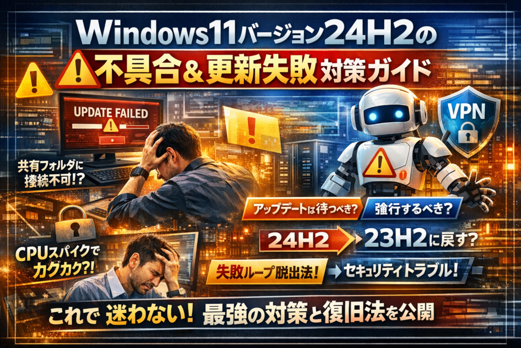 本記事では、「今24H2を入れていい人」と「絶対に様子見すべき人」を環境別に切り分け、アップデート前後のチェックポイント、Windows11 24H2から23H2に戻す現実的なパターン、WSUSやVPN、セキュリティソフトと絡んだ重大トラブルの見分け方までを、実務で使える順番に整理します。