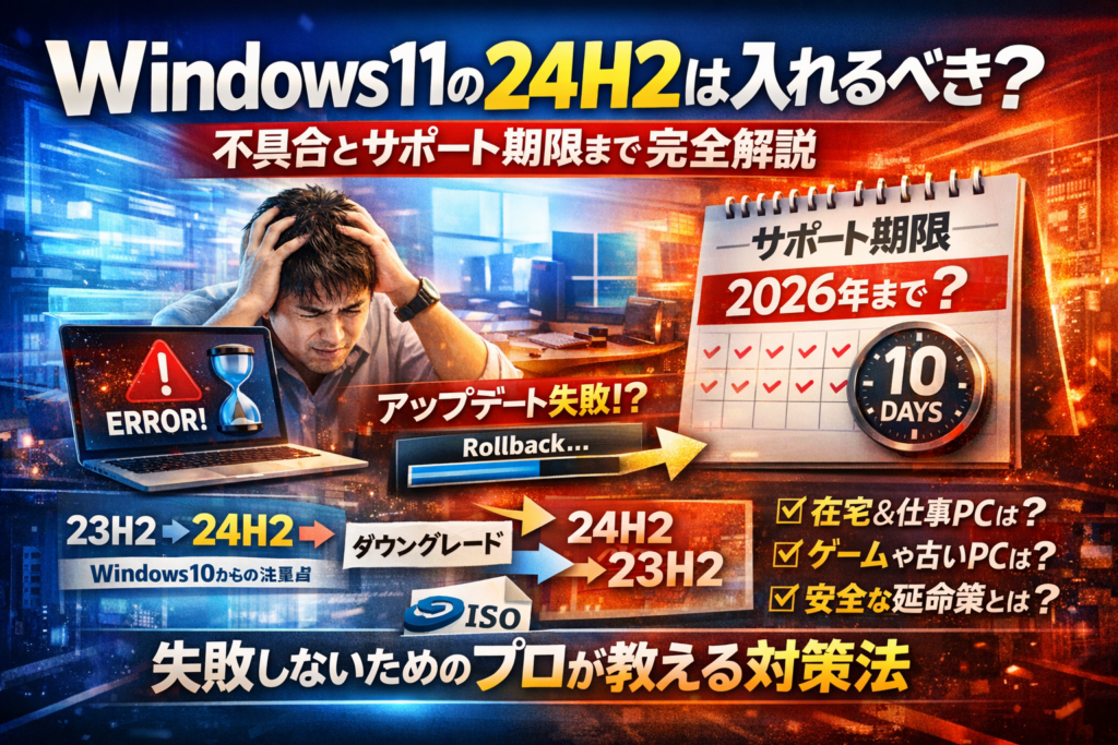 この記事を読み進めれば、「このPCはいつ24H2に上げるか」「どこまで様子見するか」「トラブル時にどう戻すか」を一本の方針にできます。逆にここを曖昧なまま24H2へ進むと、アップデートが終わらない・不具合が出た・ロールバックできない、という最悪の三重苦に巻き込まれやすくなります。
