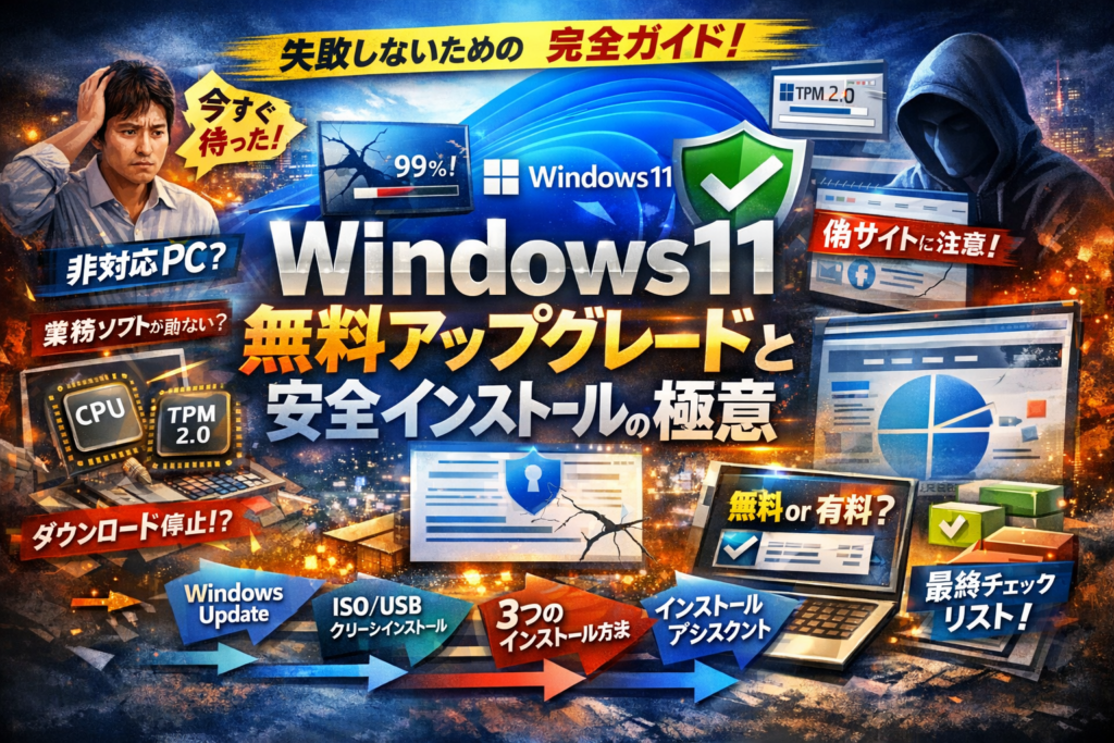 本記事では、windows11ダウンロードの前に決めるべき「やる/やらない」の基準から、Microsoft公式のダウンロードページの安全な入口、CPUやTPM2.0の対応チェック、WindowsUpdate・インストールアシスタント・ISO/USBクリーンインストールの3ルート比較、ダウンロードできない・進まないときの現場対処、無料で済む人とライセンス購入やPC入れ替えが得になる人の境界線まで、業務PCを前提に一気通貫で整理します。
