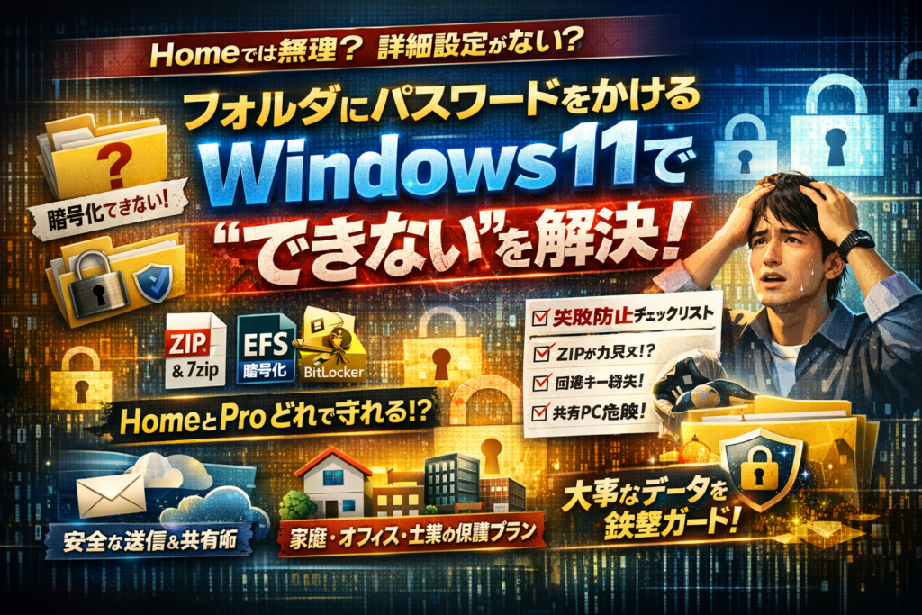本記事は、Windows11HomeとProの違いを前提から整理し、ZIPフォルダや7zip、EFS、BitLockerといった選択肢を「どれなら自分の環境で現実的に使えるか」という目線で比較します。そのうえで、「フォルダにパスワードをかけるWindows11でパスワードがかからない」「7zipで暗号化したのに元フォルダが残っていた」「BitLocker回復キーを紛失した」といった、情シス現場で実際に起きた失敗パターンを踏まえたチェックリストと運用ルールを提示します。
