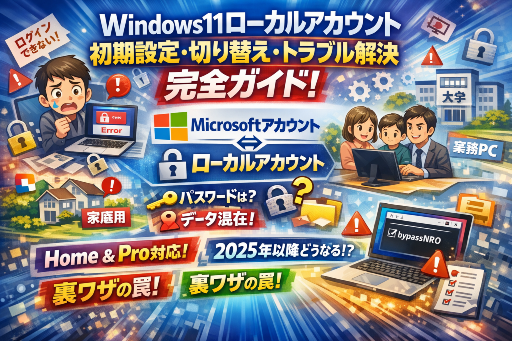 Windows11のローカルアカウントでつまずくと、初期設定のやり直しやデータ退避に平気で数時間が消えます。しかも多くの解説は「ローカルアカウント作成方法」だけで終わり、その後に起きるアカウントぐちゃぐちゃ問題や「ログインできない」「切り替えできない」トラブルまでは面倒を見てくれません。ここを雑に済ませるほど、家庭用PCでは家族のデータ混在、業務PCでは情報漏えいリスク、学校や研究室では誰が何をしたか追えない状態を招きます。