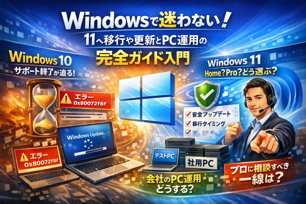 本記事では、Windows OSの仕組みを歴史ではなく「今の自分に関係する部分」だけに絞り、Windows10とWindows11のサポート期限、Windows11 Home/Proの選び方、Windowsバージョン確認と安全なアップデート運用、0x80072f8fや0xc1900101などエラー時の最初の一手まで、現場で実際に使われている手順だけを整理します。さらに、仕事用PCをWindows11へ移行するタイミング、Windowsノートパソコンの寿命を左右する条件、PCが10台を超えた会社でのゆるい情シス設計まで、「どこまで自力でやり、どこからプロに任せるか」の線引きも示します。