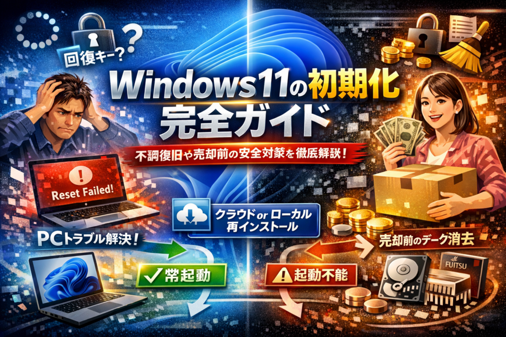 本記事では、windows11 初期化でやりたいことが「不調の改善」なのか「売却・譲渡の前準備」なのかをまず切り分けたうえで、通常起動できる場合、ログイン不可や自動修復ループの場合、完全に起動しない場合のルートを整理します。さらに、クラウドダウンロードとローカル再インストールの正しい選び方、回復キー問題、富士通などメーカー独自リカバリと工場出荷状態の違い、売却時に必須のドライブクリーニングまで、現場で実際にトラブルになっているポイントだけを抽出しました。読み進めれば、自分のPCでどの手順を選べば安全にやり切れるかが一度で判断できるはずです。