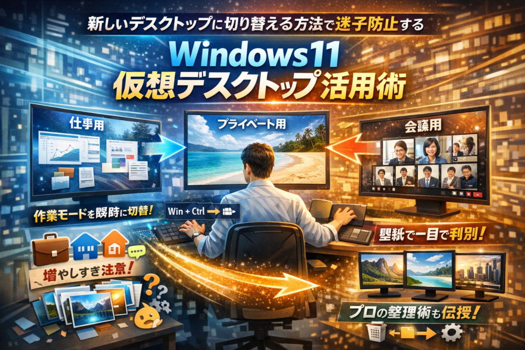 本記事では、単なる「新しいデスクトップに切り替える方法」を超えて、Windows11/10の仮想デスクトップを仕事用・プライベート用・会議用などにどう割り当てるか、ショートカットが効かない環境で何を確認すべきか、「いらない」と感じた時にどう削除・整理すればいいかまで、実務前提で整理します。さらに、マルチディスプレイとの違いや、壁紙やアイコン配置で瞬時に見分けるプロの工夫も具体化しました。この記事を読み終える頃には、自分に必要なデスクトップ数と切り替えルールが明確になり、「増やしすぎて探す時間」がゼロに近づきます。今の混乱を一度でリセットしたい方だけ、先へ進めてください。