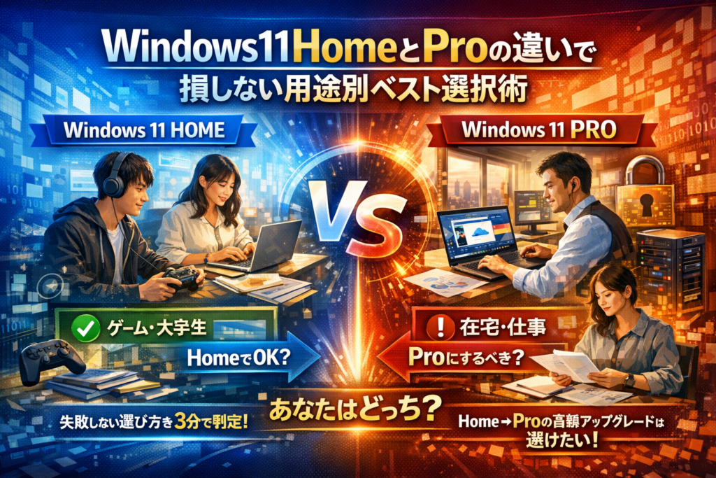 ここ数年、パソコン導入相談を受ける中で、「最初にHomeで買ってしまい、在宅勤務のリモートデスクトップや顧客情報管理が始まった途端、急いでProに入れ替えた」という相談を、中小企業や個人事業主から何十件も受けてきました。逆に、量販店で「社会人になるならPro」と勧められ、高いモデルを買った大学生が、4年間ゲームとレポート作成だけで終わり、「この差額ならメモリ16GBにしておけばよかった」と後悔しているケースもあります。私自身も、自社のBYODルールを整える際、Homeが混ざったことで管理が複雑になり、結局Proへの統一と再設定に丸一日失ったことがあります。こうした「用途とOSエディションのミスマッチ」は、知識不足ではなく、仕様表が日常の使い方に翻訳されていないことが原因です。この記事では、ゲーム中心の学生、在宅ワーカー、フリーランス、小規模法人の現場で実際に見てきた判断基準を、そのまま選び方の軸として整理しました。購入前の数分の判断で、3年後の無駄な出費と手間を確実に避けてほしい、という思いで書いています。