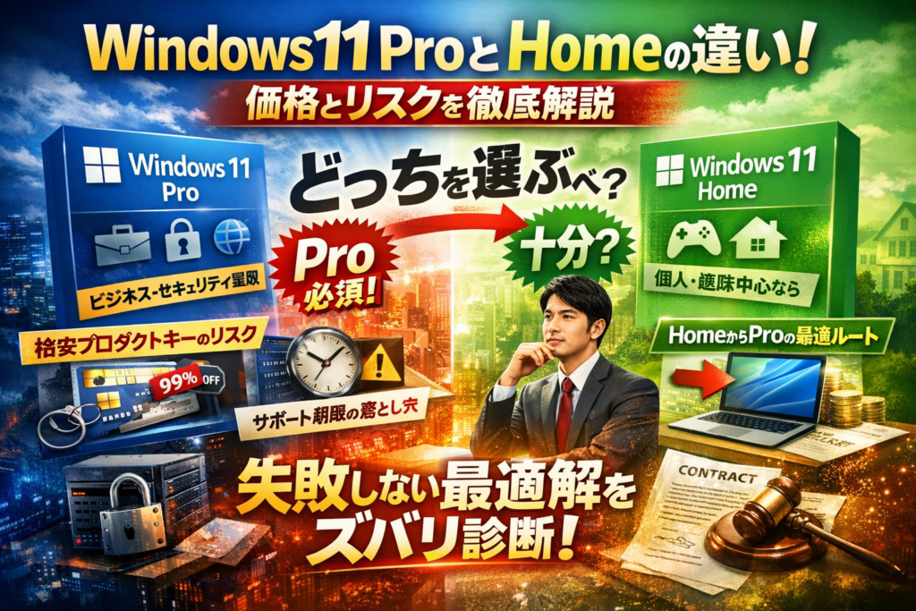 本記事では、Windows 11 Pro Home違い、Windows 11 Pro 価格比較、OEM/DSP/リテールのライセンス差、22H2や24H2のサポート期限、Windows 11 HomeからProへのアップグレード料金と具体ルート、そして格安キーやマーケットプレイス版のリスクまで、販売側があまり語らない「失敗パターン」を軸に整理します。