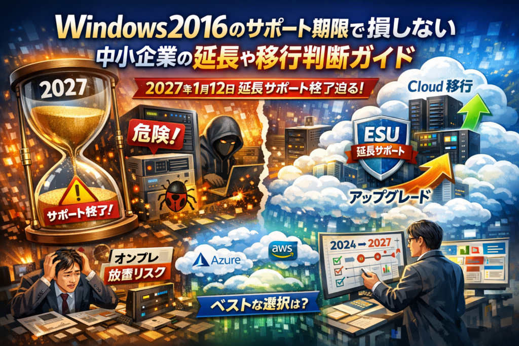 Windows Server 2016の延長サポートが2027年1月12日で終了し、その前にWindows 10やOffice 2016、SQL Server 2016も順次サポート期限を迎えます。期限以降はセキュリティ更新プログラムもテクニカルサポートも止まり、サーバーは「動いているのにリスクだけ増え続けるOS」に変わります。それなのに、多くの中小企業ではオンプレ環境で複数の業務システムやデータが1台のサーバーに同居し、どこから手を付けるか分からないまま時間だけが過ぎています。単に日付を知るだけでは運用も対策も進まず、クラウド移行やESU、ハードウェア更改などの選択肢も、コストと業務影響の観点で整理しなければ企業として損をします。この記事では、メインストリームと延長サポートの違いから、AzureやAWSでの移行先比較、オンプレESUやマネージドサービスの現実的な利用条件、「やってはいけない延長策」、情シス1人でも回せる逆算スケジュールまでを一気に整理します。読めば、自社のWindows Server 2016環境をいつまでどう運用し、どのタイミングでどのOSへアップグレードすべきかが明確になり、無駄な投資と致命的なセキュリティリスクを同時に避けられます。