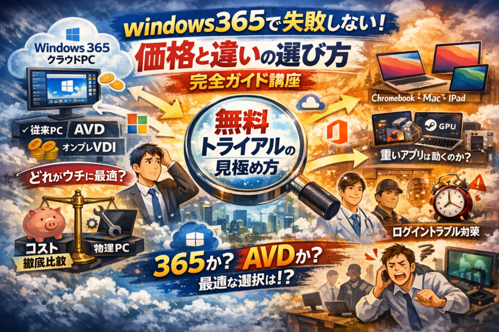 あなたの会社のクラウドPC検討が進まない原因は、windows365そのものではなく、「何とどう比べるか」が整理されていないことにあります。windows365 とは何か、Microsoft365やOffice365、AVD、オンプレVDIとの違い、chromebookやmac、ipadから使う時の実態、そして月額価格が本当に「高い」のかどうか。この軸が曖昧なままカタログだけ眺めても、判断は永遠に保留のままです。