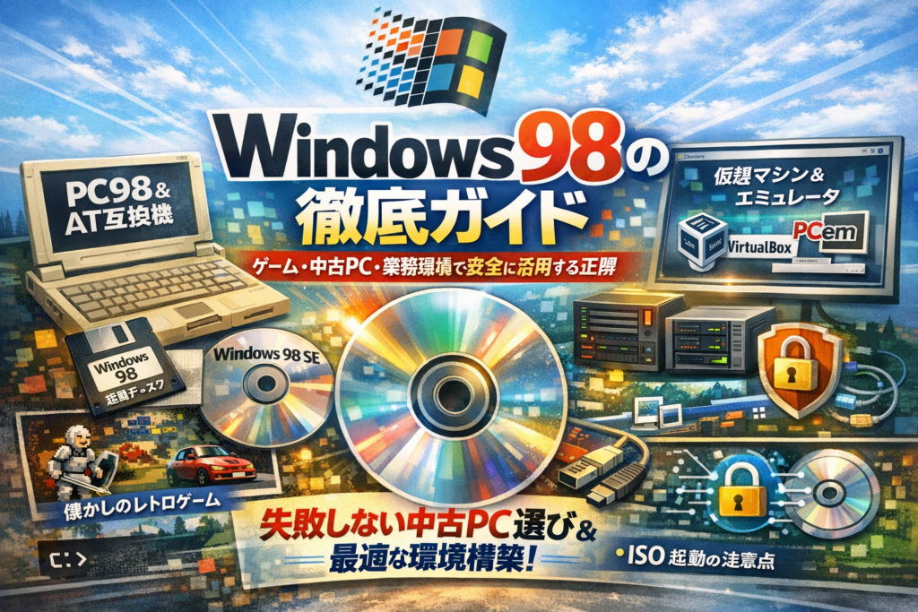 本記事では、Windows 98とWindows 98 Second Editionの違い、当時のPC98やAT互換機の背景から、config.sysやMS-DOS、Service Pack、Update CD ROM、USB・ネットワーク仕様までを一度整理した上で、目的別に最短ルートを示します。レトロゲームをWindows10・Windows11で動かす方法、VirtualBoxやVMware、PCem、DosBox、98jsなどのエミュレータ選び、Windows 98 ISOや起動ディスクの技術的・法的な注意点、中古ノートやデスクトップ、PC9821のジャンク回避チェックも具体的に押さえます。さらに、まだWindows 98やXPを抱える企業向けに、仮想化やネットワーク分離、段階的リプレイスまで含めた「延命と卒業」の現実解を提示します。